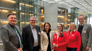 Die Vorsitzende des Ausschusses für Sport und Ehrenamt, Aydan Özoguz (Mitte), mit DLRG Präsidentin Ute Vogt (3.v.r.), DLRG Generalsekretärin Tanja Larsson (2.v.r.) sowie vom DSV Präsident David Profit (2.v.l.), Vorstandsvorsitzender Jan Pommer (rechts) und dem Vorsitzenden der Deutschen Schwimmjugend, Uwe Hermann (links). Foto: DLRG